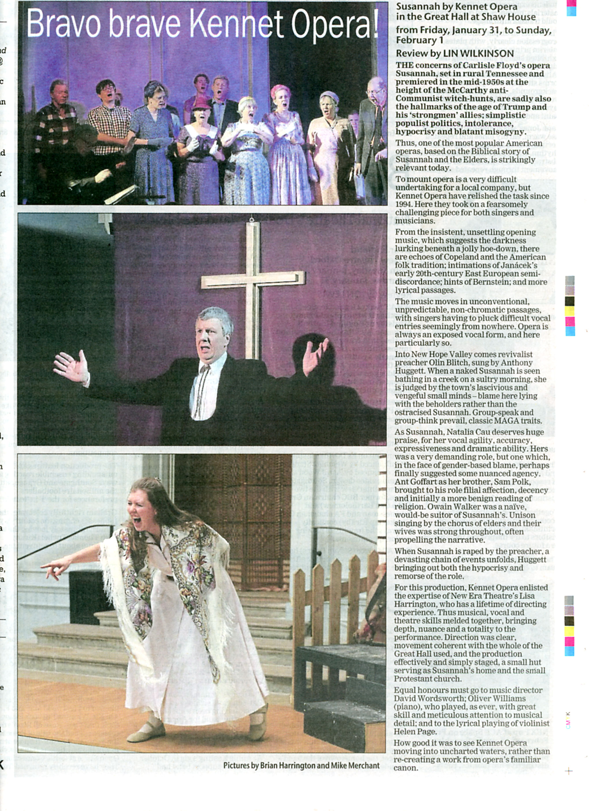 A reviewer got it right when she wrote about 'a fearsomely challenging piece for both singers and musicians'. And music director David Wordsworth, in his first staged production for Kennet Opera, told the team: 'I know that Susannah perhaps took some of you out of your comfort zone but I'm so glad that I suggested the piece and that we pulled together to make it work.'
